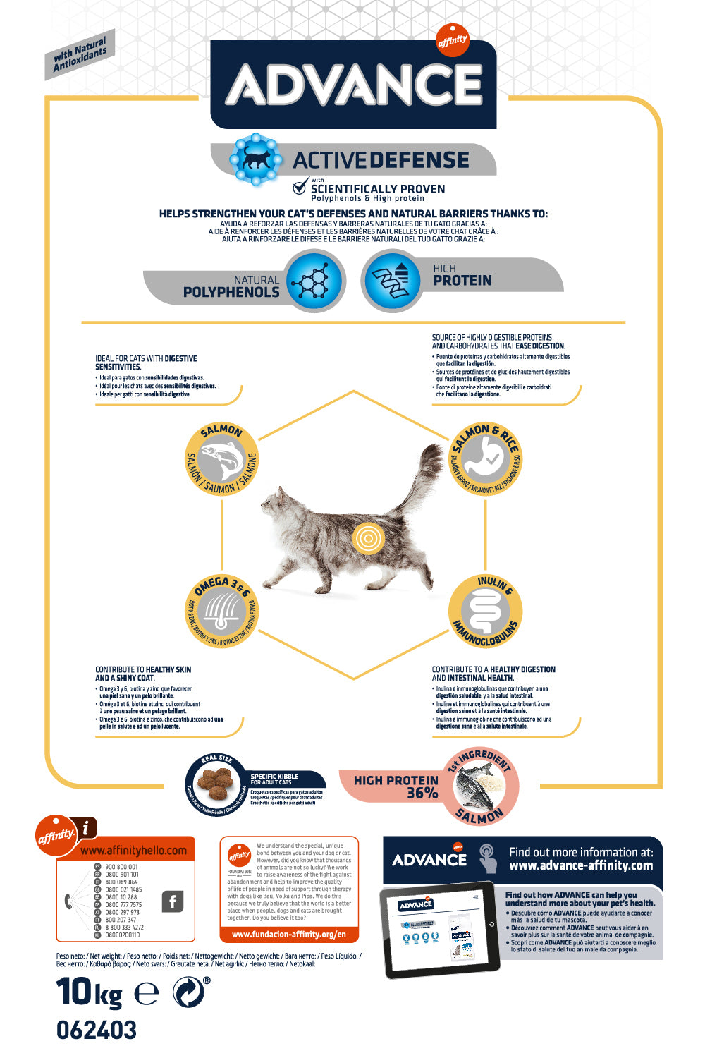 Advance Cat Adult Sensitive Salmon 10 kg is een smakelijk, volledig speciaal kattenvoer gemaakt voor katten met een gevoelige maag of huidproblemen. Veelal hebben katten met maagproblemen klachten aangaande de vertering en de huid. Dit voer haalt eiwit uiteen gemakkelijk verteerbare eiwitbron (zalm), wat samen met rijst een goede spijsvertering ondersteunt. Omega 3 & 6 zorgen bovendien voor een gezonde en glanzende vacht. Daarnaast zijn de brokken zeer smakelijk, voor een goede acceptatie! Volledig voer specifiek geformuleerd voor volwassen katten.