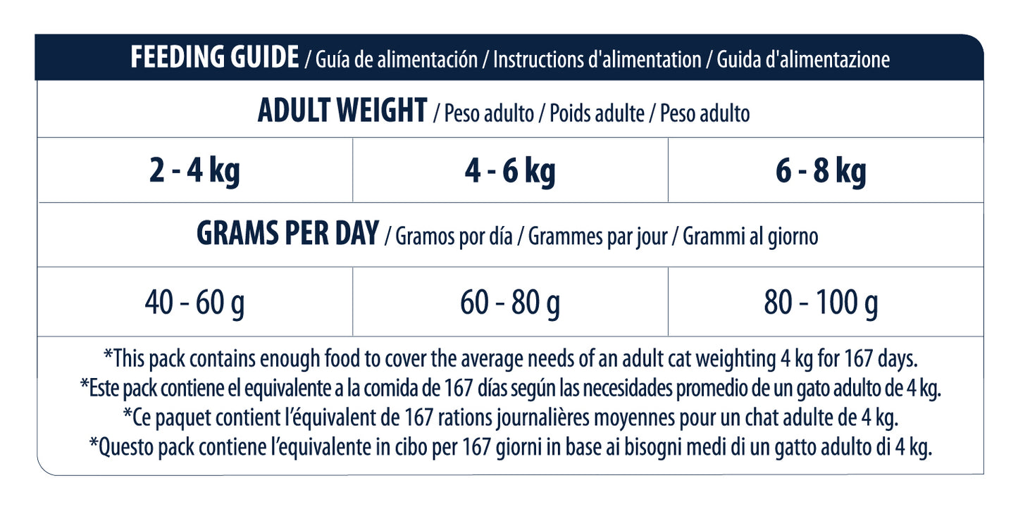 Samenstelling: Zalm (18%), maïseiwit, rijst (15%), gedehydrateerde zalmeiwitten, tarwe, dierlijk vet, gestabiliseerd met een mengsel van tocoferolen van natuurlijke oorsprong, tarwe-eiwit, maïs, eiwithydrolysaat, bietenpulp, kaliumchloride, plasma-eiwitten, natuurlijke bron van immunoglobulinen (0,4%), inuline (0,4%), natuurlijke polyfenolen (0,01%)