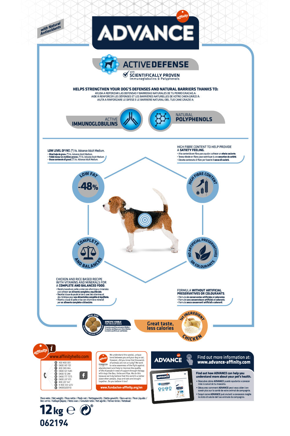 Advance Medium LIght 12 kg is een smakelijk hondenvoer, speciaal gemaakt voor honden van middelgrote rassen (vanaf 10 kg) met (het risico op) overgewicht. Dit smakelijke voer van Advance is gemaakt op basis van kip en rijst en speciaal samengesteld voor honden met overgewicht op het risico daarop. Het voer heeft een formule met weinig vet en veel eiwit; zo help je het gewicht van jouw hond te controleren zonder dat er spiermassa verloren gaat. Door het hoge vezelgehalte voelt jouw hond zich verzadigd en de samenstelling met kip en rijst zorgt voor een goede spijsvertering. Gemaakt zonder kunstmatige conserveringsmiddelen of kleurstoffen! De brokjes zijn speciaal aangepast aan het formaat van de hond en helpen een gezond gebit te ondersteunen.