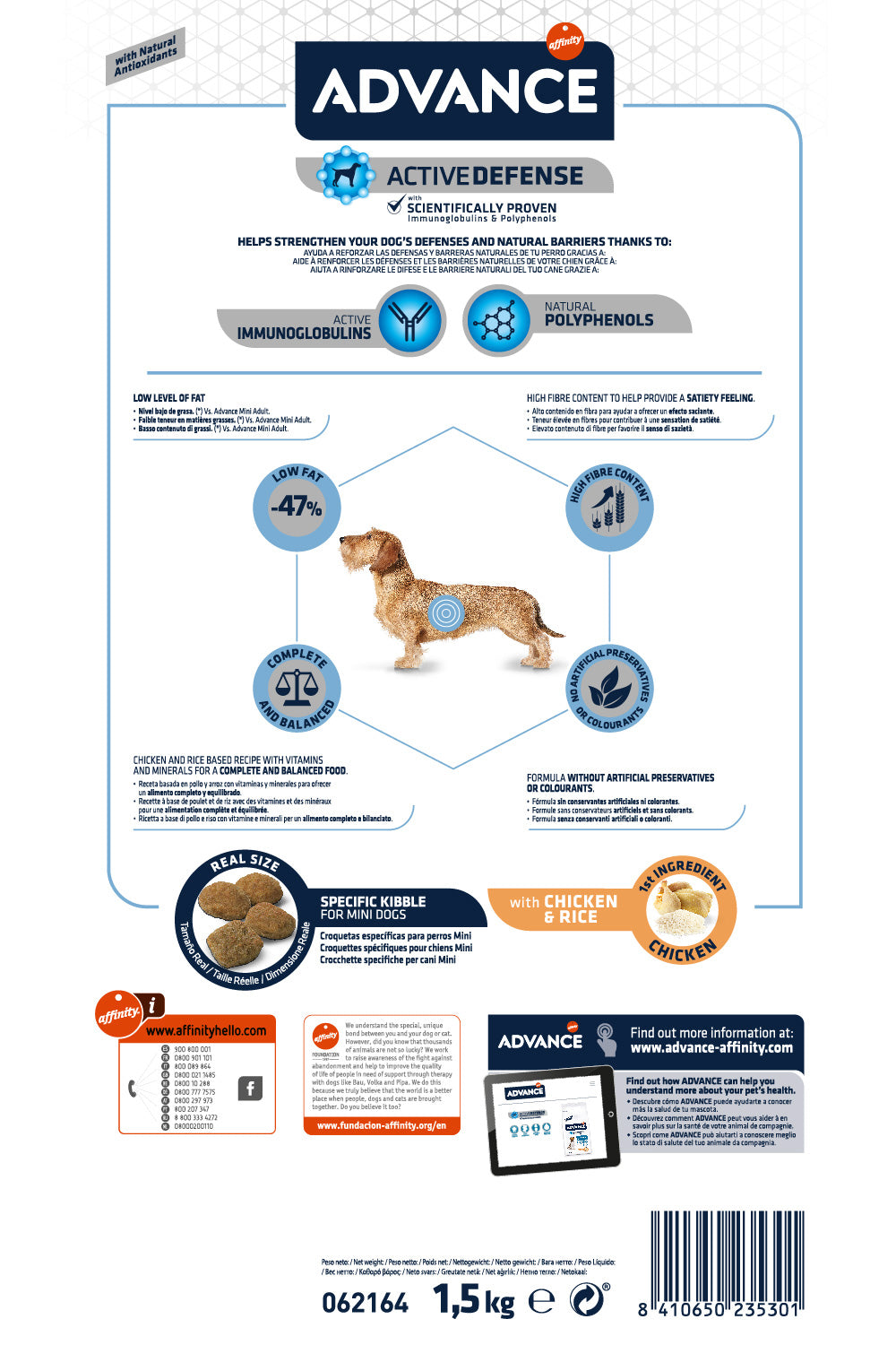 Advance Mini Light 1,5 kg is smakelijk en uitgebalanceerd hondenvoer, speciaal ontwikkeld voor kleine rassen (tot 10 kg) met aanleg voor overgewicht.