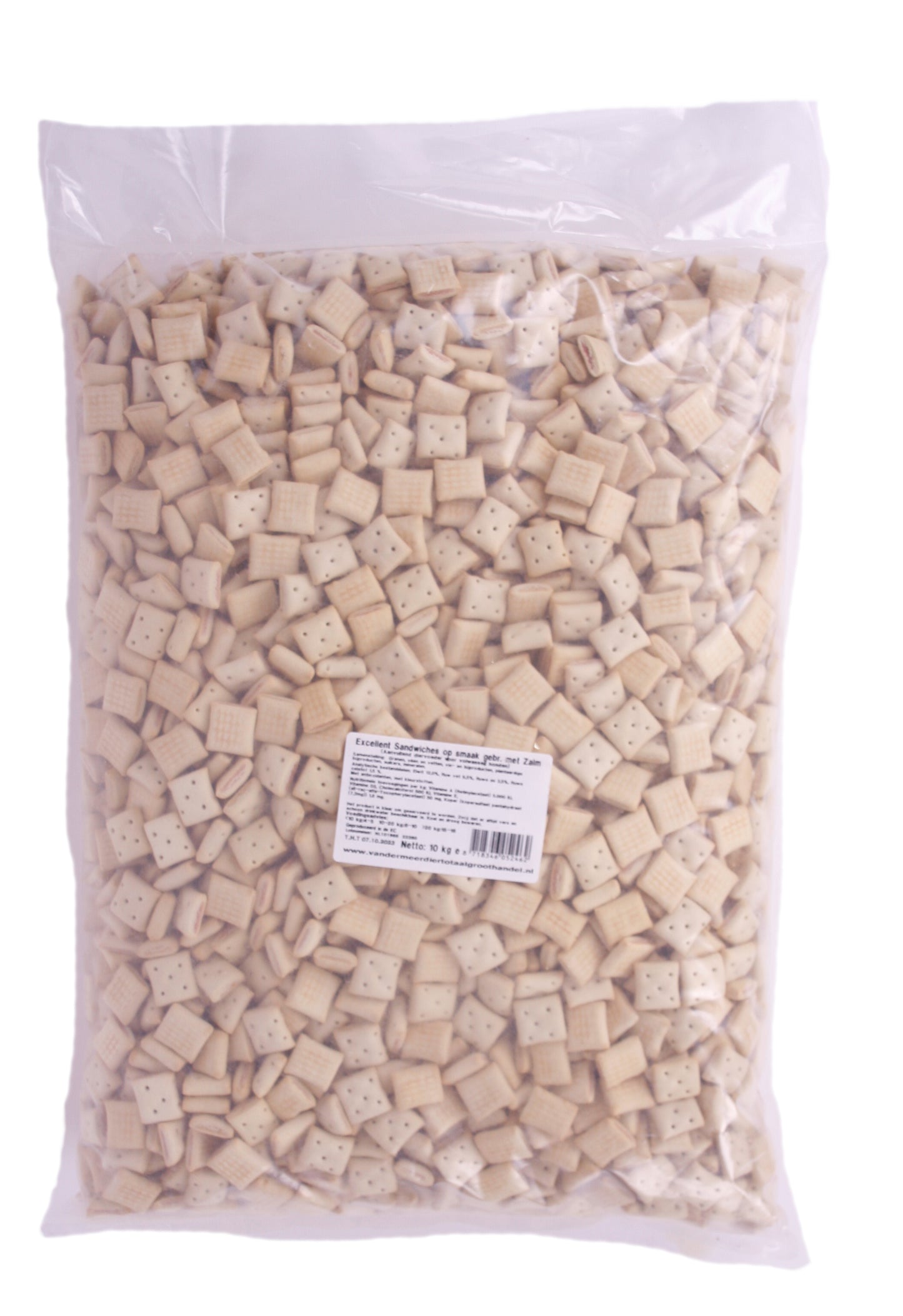 De Excellent Zalm Sandwiches 10 kg is heerlijk aanvullend diervoeder voor volwassen honden in de vorm van sandwich biscuitjes, perfect om te geven als beloning. In deze grote zak van 10 kilogram zitten sandwich koekjes waar jouw hond heerlijk mee kan snacken. De knapperige biscuit koekjes zijn de ideale beloning tijdens het trainen of als traktatie tussendoor. De koekjes zijn samengesteld uit vis, mineralen, oliën en vetten en dienen zo als voedzaam tussendoortje.