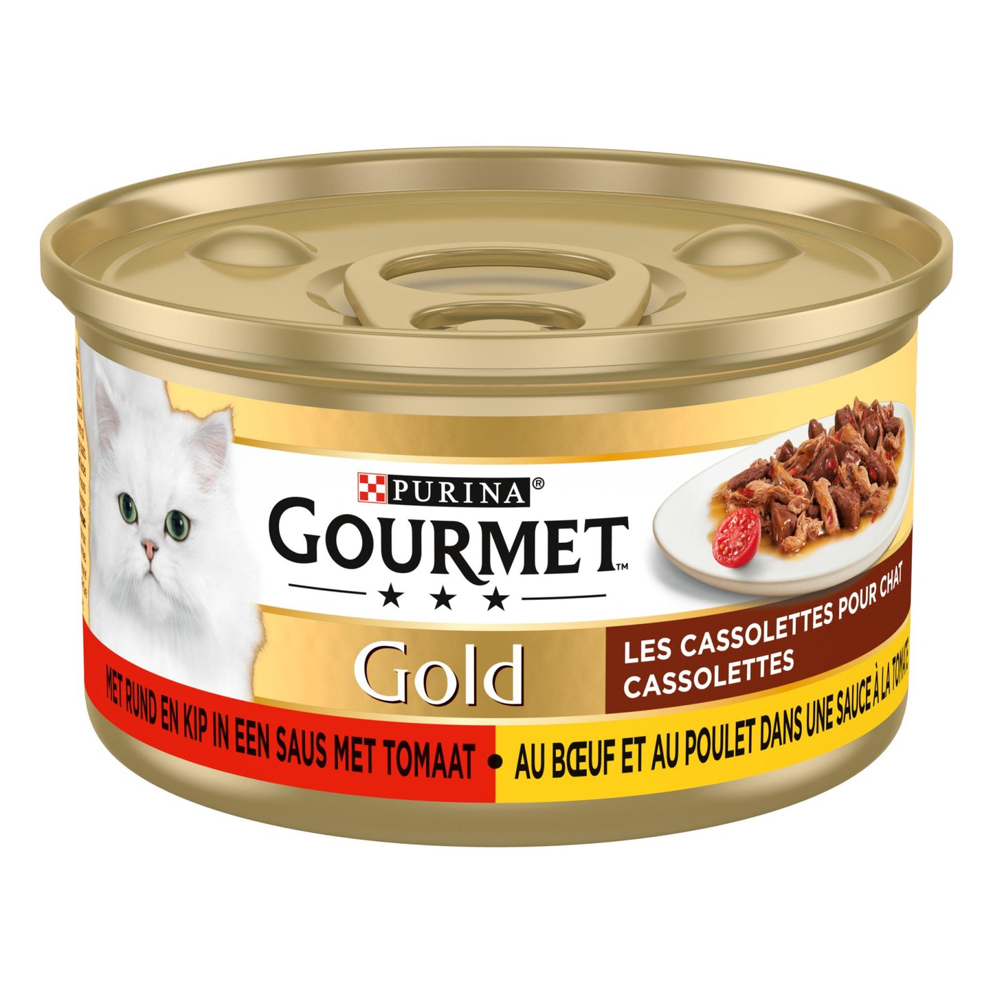 Gourmet Gold cassolettes is het vertrouwde recept voor uw kat verpakt in een goudkleurig blikje van 85 gram.