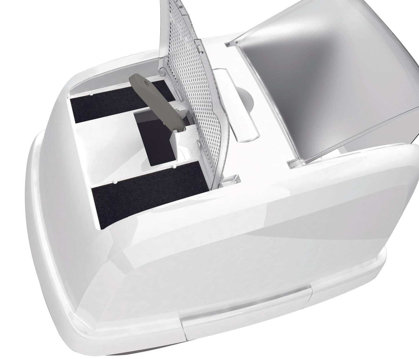 De klep van deze kattenbak bestaat uit twee delen. Het eerste deel is de flap waar de kat door in- en uit kan stappen het tweede is een verlengde hiervan aan de bovenzijde van de bak. Dit kun je als baas eenvoudig terugklappen, waardoor je makkelijker bij de inhoud van de bak komt en zo sneller en gemakkelijk kunt schoonmaken. Het kattenbakschepje is ook meegeleverd, en bevindt zich achterop de kattenbak, mooi weggewerkt en toch makkelijk bereikbaar. Ook is de kattenbak voorzien van een koolfilter; dit zorgt ervoor dat nare luchtjes worden geabsorbeerd en je minder last hebt van een ruikende kattenbak.