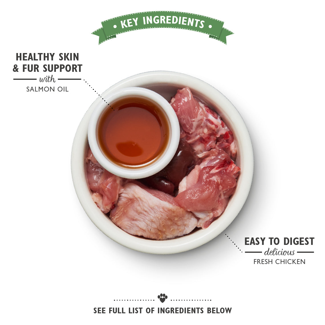 Samenstelling: Kip (65%), Mineralen, Zalmolie, algen