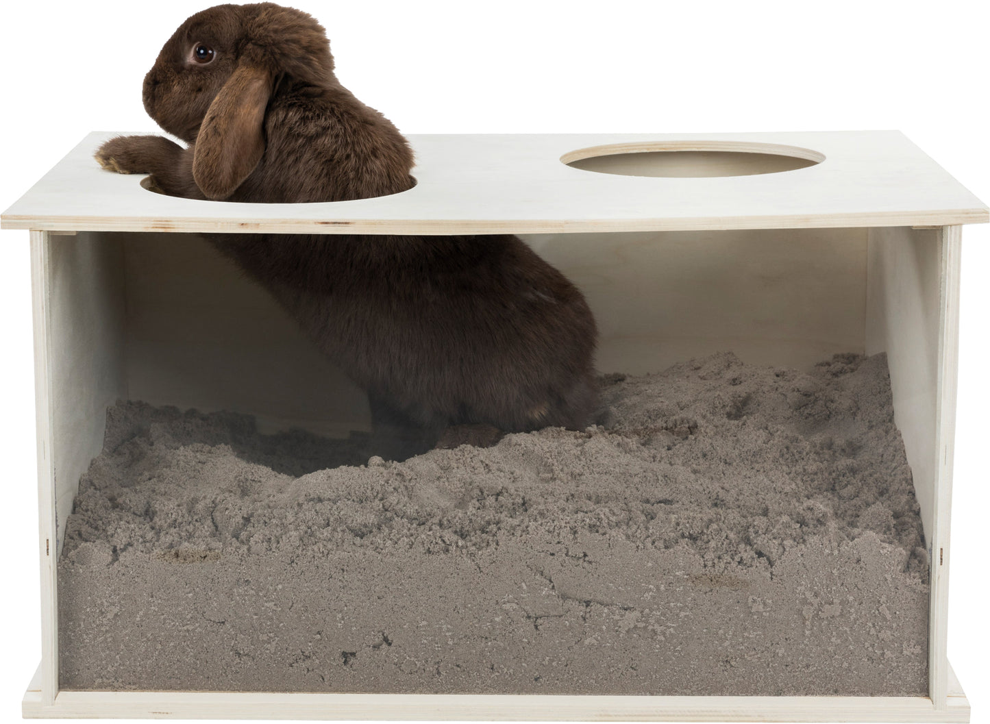 - Zandbak om lekker in te graven, voldoet aan de natuurlijke graafbehoefte van konijnen
