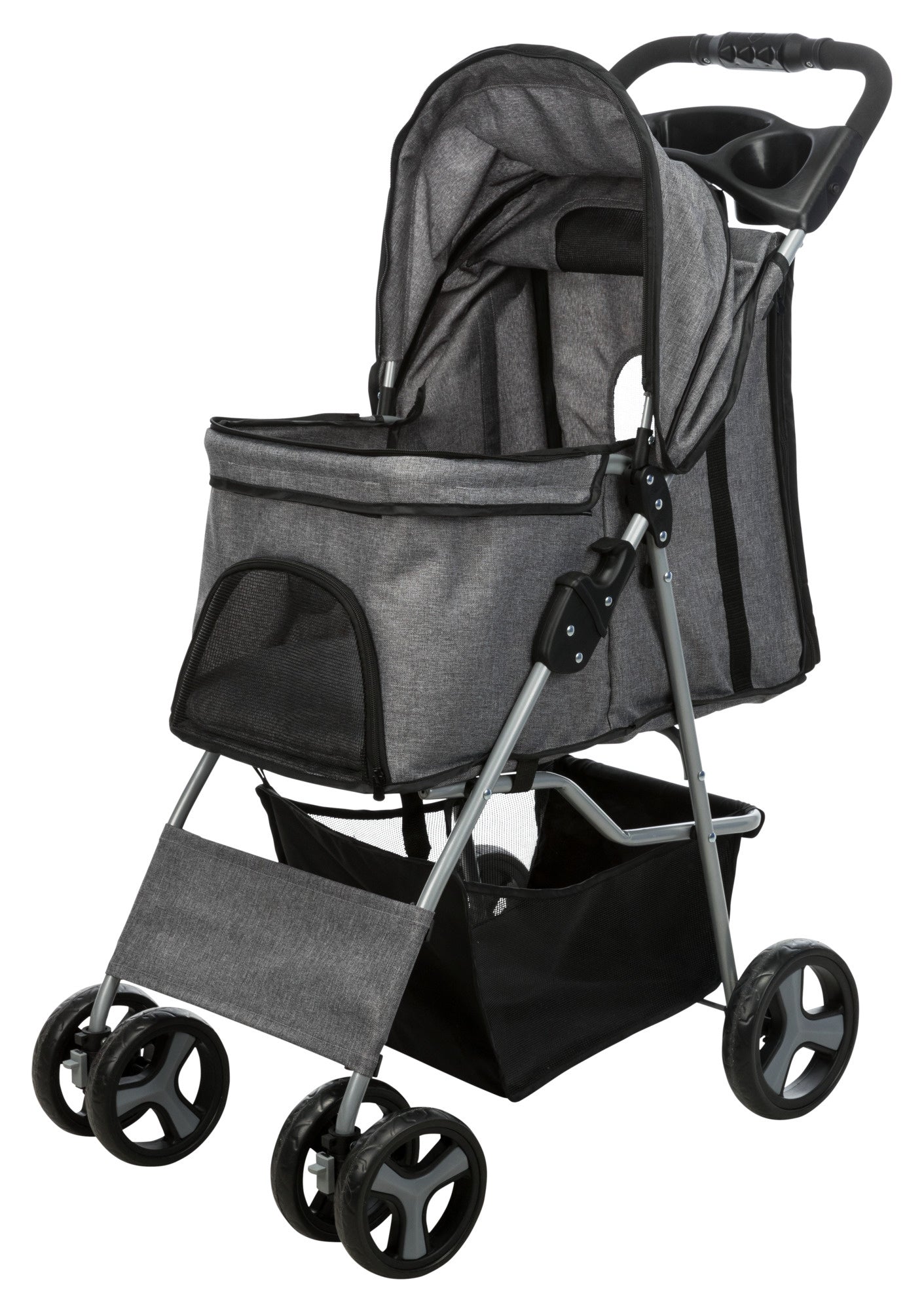 De Trixie Hondenbuggy Grijs 47X80X100 cm is een inklapbare hondenbuggy met vier wielen, eenhandsbediening en parkeerremmen. Deze buggy zorgt ervoor dat ook oude, zieke, angstige of zeer jonge honden en katten mee op pad kunnen. De buggy is comfortabel en veilig door de vier wielen, die voor meer stabiliteit zorgen, en de twee parkeerremmen. Bedienen kan met één hand door de duwstang: zo kun je ook nog een andere hond aan de lijn meenemen. De duwstang, fleshouder en het mandje zijn bovendien gevoerd voor meer comfort. Een grote achterklep helpt bij het in en uitstappen en de korthouders (twee stuks) voorkomen dat het dier per ongeluk uit de buggy kan springen. Je kunt de buggy deels of geheel afgesloten gebruiken door de ritssluitingen en hem zo aanpassen op elk weertype en elke passagier. Ook in dichte toestand is er voldoende ventilatie en zicht door de gaas-inzetstukjes. Deze buggy komt met een uitneembaar kussen met afneembare bekleding.