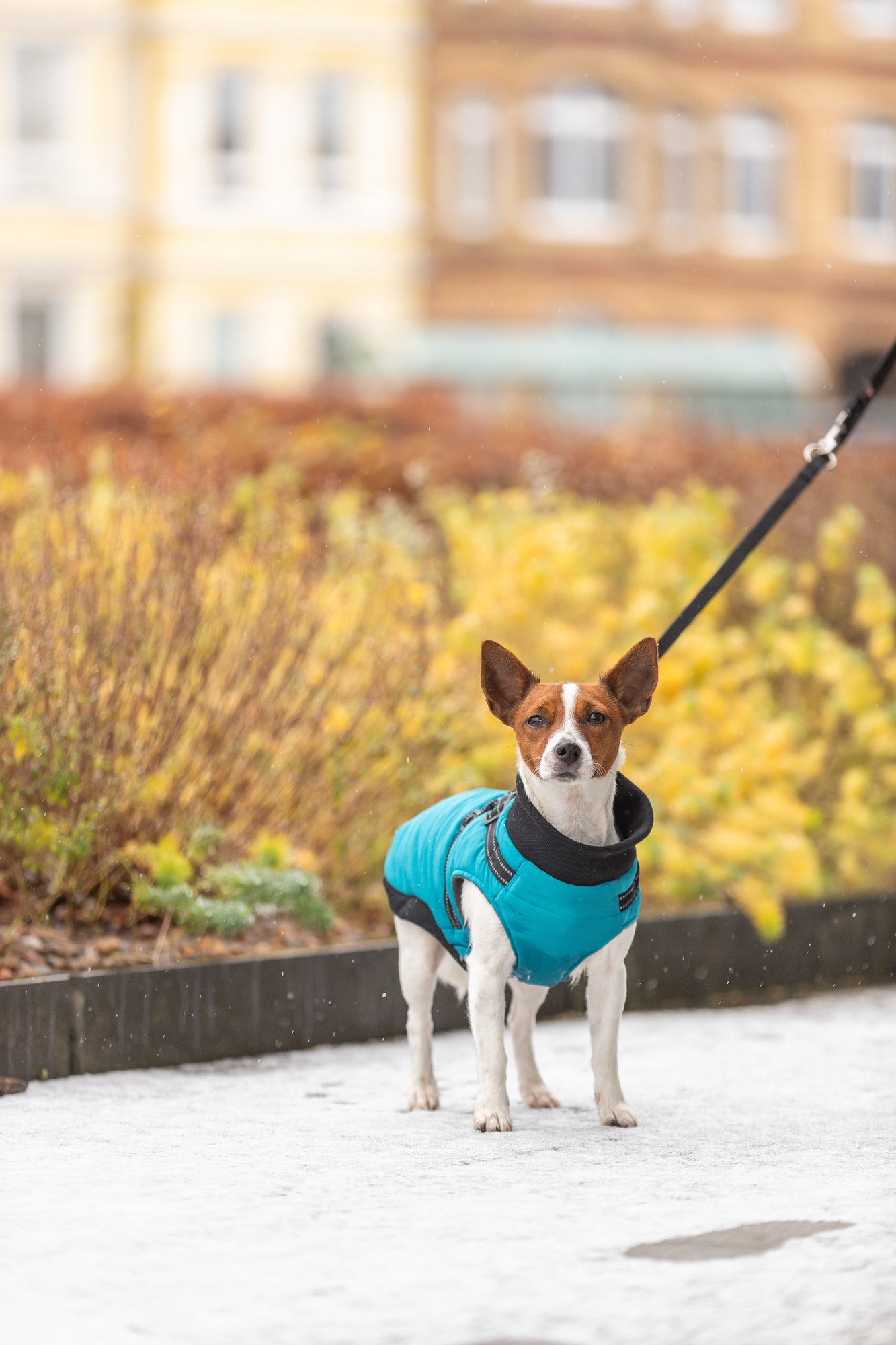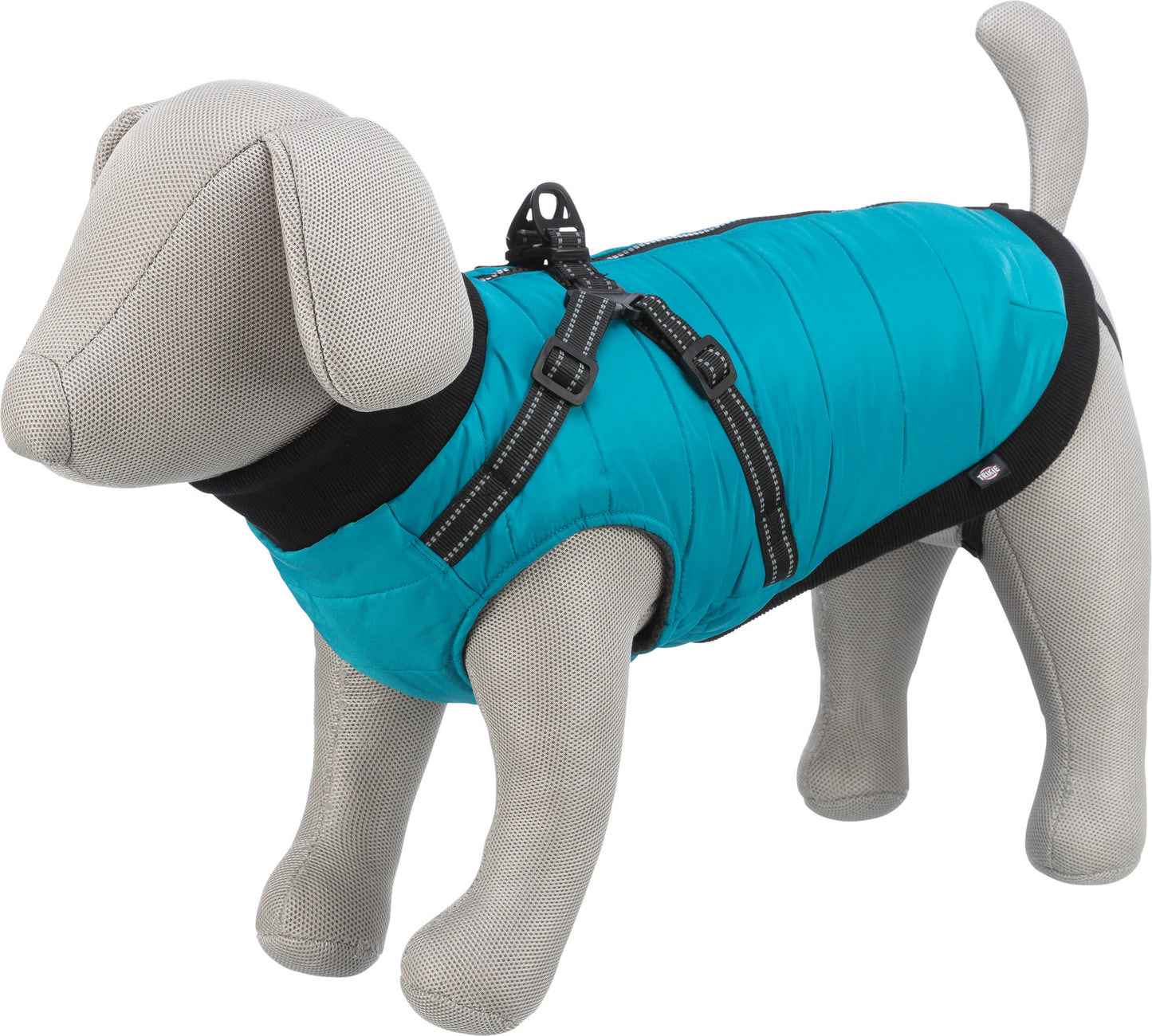 De Trixie Hondenjas Pontis Met Tuig Aqua 40 cm is een handige jas met kraag voor de hond die waterafstotend is, met een geïntegreerd tuig.
