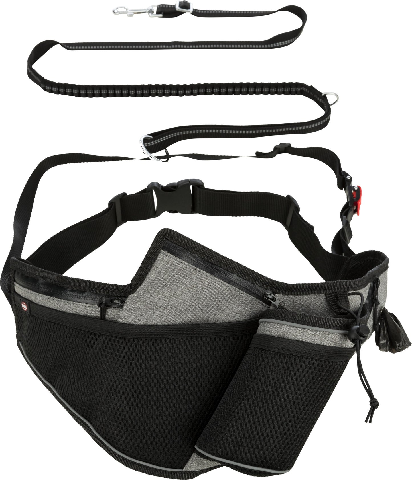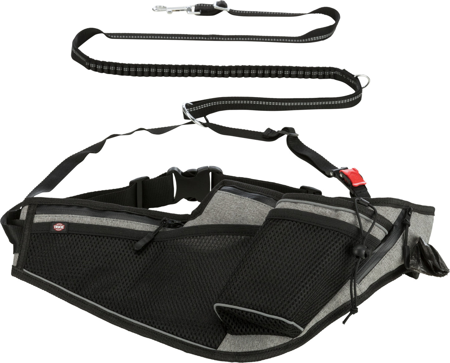 De Trixie Joggingriem Met Lijn Grijs / Zwart 115 - 150 cm is een joggingceintuur voor canicross en hardlopen met de hond, met trekontlasting en aanlijn-systeem voor comfortabel samen sporten. Deze handige lijn van Trixie is speciaal ontworpen voor canicross en voor mensen die graag met hun hond wandelen en joggen. Het aanlijnsysteem verdeelt de impact van het trekken van de hond gelijkmatig over de taille van de loper en plotseling trekken van de hond wordt door de schokdemper opgevangen. De gesp met trekontlasting zorgt voor meer veiligheid en door de traploos verstelbare riem met handlus maakt de riem ook geschikt voor normaal wandelen. Het ergonomisch design en zachte inzetstuk van mesh zorgt bovendien voor veel draagcomfort. Tot slot is de riem voorzien van diverse vakken, een bekerhouder, reflecterende elementen én een poepzakjesdispenser zodat je altijd alles bij de hand hebt!